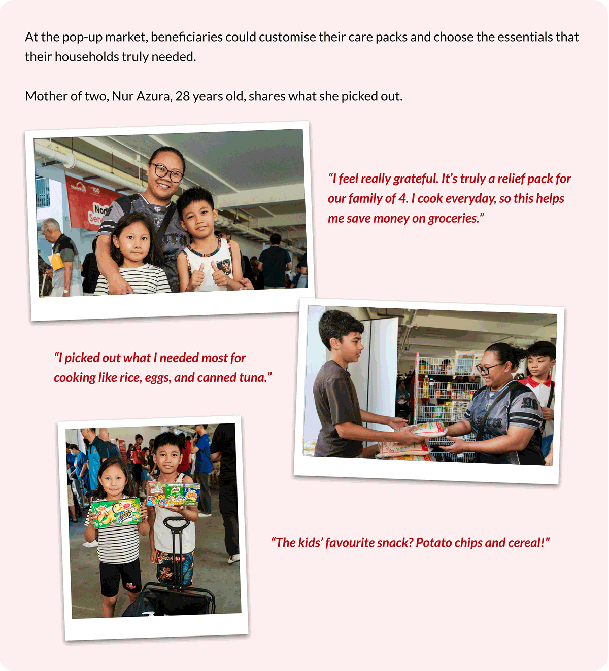 They took over the pop-up market, assisting residents from public rental and local welfare schemes to customise their care packs of essential food and daily necessities. They also set up a Children’s Day carnival with game booths, a bouncy castle, and free snacks. Their efforts captured the joy and impact of lending a hand in the community.