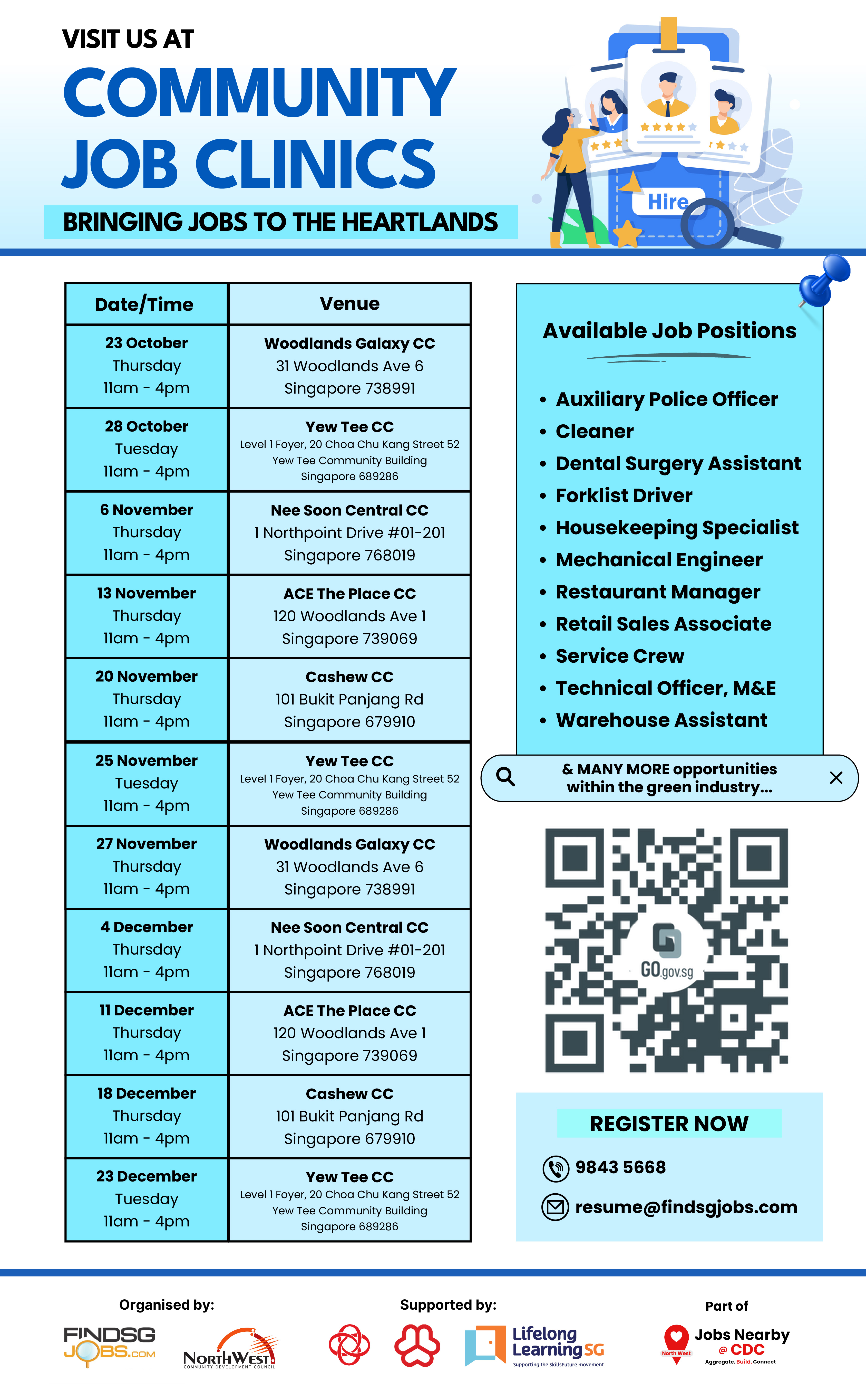 The job clinics are now right within your neighbourhood! Speak to our Job Ambassadors to discover available roles near you, and personalised career guidance between jobseekers and potential employers.